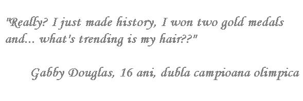 Este vorba despre Gabby Douglas si discutia creata artificial in jurul ei. Gabby (Gabrielle) Douglas are doar 16 ani, este prima gimnasta din Statele Unite care castiga doua medalii de aur la aceeasi Olimpiada (la individual si la echipa), dar si prima gimnasta de culoare din istoria Olimpiadelor care castiga astfel de medalii. Cu toate astea, in tot entuziasmul si emotia triumfului ei, cea mai importanta conversatie a momentului respectiv a fost despre… parul ei!