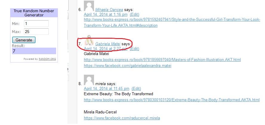 Concursul se desfasoara de azi, 14 aprilie pana duminica, 20 aprilie inclusiv. Castigatoarea va fi aleasa prin random.org si va anuntata oficial (pe blog, facebook si email) a doua zi, luni, 21 aprilie.