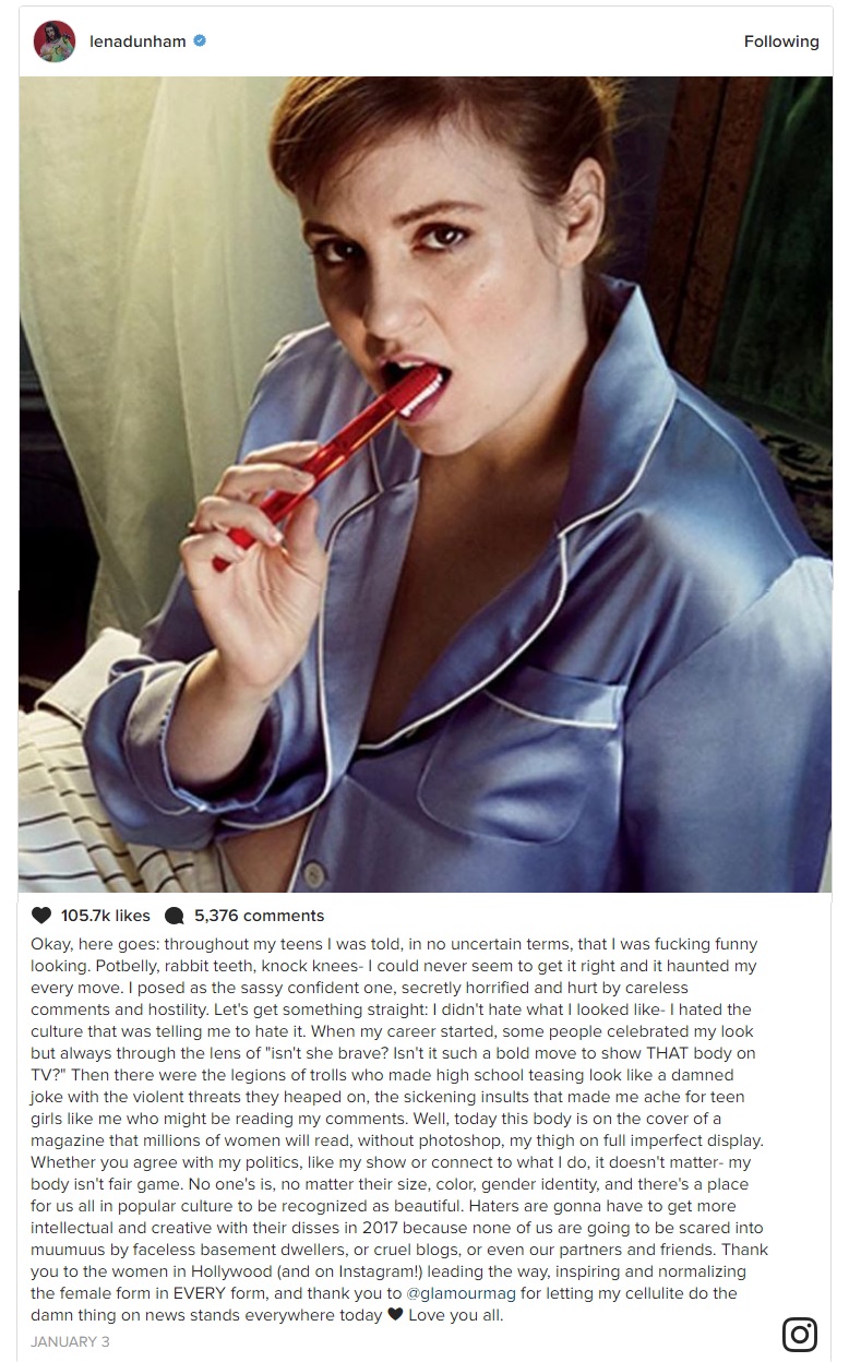 Imediat dupa aparitia copertii ei, Lena a scris un post mai lung pe Instagram, il aveti reprodus mai jos. „Throughout my teens I was told, in no uncertain terms, that I was fucking funny looking. I didn’t hate what I looked like – I hated the culture that was telling me to hate it. When my career started, some people celebrated my look, but always through the lens of ‘isn’t she brave? Isn’t it such a bold move to show THAT body on TV?’. Well, today this body is on the cover of a magazine that millions of women will read, without Photoshop, my thighs on full imperfect display. Whether you agree with my politics, like my show or connect to what I do, it doesn’t matter – my body isn’t fair game. No one’s is, no matter their size, color, [or] gender identity…. thank you to the women in Hollywood (and on Instagram)…. normalising the female form in EVERY form.”