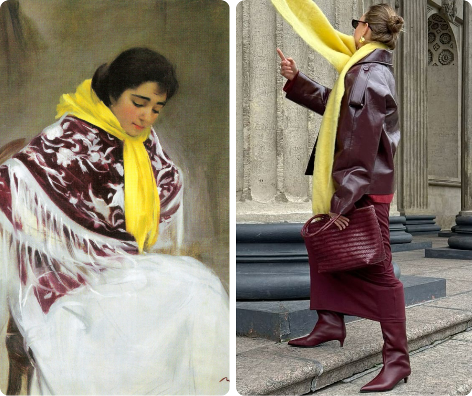 In sfarsit, sa nu ne fie teama sa introducem o pata de oranj intr-un look ciocolatiu (tot un tablou de Ron Hicks), sa cautam o rochie neagra lunga pe cat de versatila, pe atat de rafinata (exemplul din tabloul Nikoletei Sekulovic), sa innodam sireturi albastre la niste botine cafenii (cum ne arata Hope Gangloff), sa imbracam un blazer negru cu niste pantaloni largi caramel (ca domnul pictat de Walter Langley) si sa aducem la viata maroul si albastrul cu o picatura de roz trandafiriu (cum face aceasta bunica, intr-un alt tablou al lui Langley).